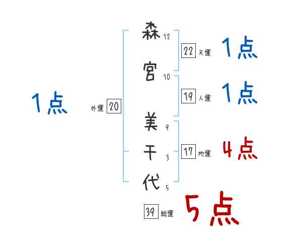 天運![]() | 森宮美千代さんの天運は22画の1つ星!努力することが苦手ないっぽう手先が器用。芸術性にも優れる。 家系が持つ宿命的な運勢を表します。祖先から受け継いだ苗字ですので自分の力が及びません。家柄を象徴します。 |
