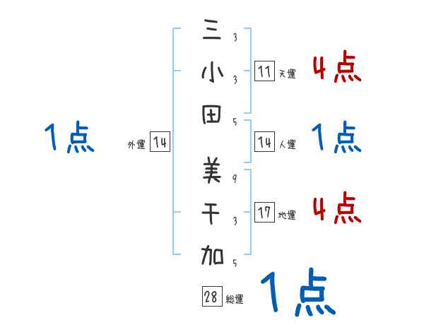 外運![]() | 三小田美千加さんの外運は14画の1つ星!人に対して優しいがストレスを溜め込みがち。人間関係のトラブルを避けるよう気をつけましょう。 生活面を象徴する運勢です。外部から受ける影響力を表し、結婚運、家庭運や職場、環境への順応性を表します。 |