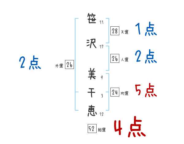 外運![]() | 笹沢美千恵さんの外運は26画の2つ星!波瀾万丈かも。信頼できる人を大事にしましょう。 生活面を象徴する運勢です。外部から受ける影響力を表し、結婚運、家庭運や職場、環境への順応性を表します。 |