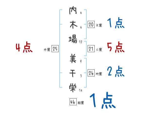 総運![]() | 内木場美千栄さんの総運は46画の1つ星!迷走することが多く苦労するかも。目先のことにとらわれないように。 あなたの人生を表す1番重要な運勢です。生涯を通じて影響する総合運となり、主に50歳以降の晩年期に影響を及ぼします。 |