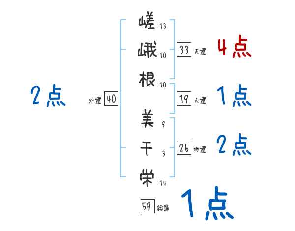 天運![]() | 嵯峨根美千栄さんの天運は33画の4つ星!権力志向でプライドが高い。勇気があり運を切り開き成功する。 家系が持つ宿命的な運勢を表します。祖先から受け継いだ苗字ですので自分の力が及びません。家柄を象徴します。 |