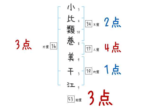 天運![]() | 小比類巻美千江さんの天運は34画の2つ星!独創性に優れるが、自尊心が強く災難に注意しましょう。 家系が持つ宿命的な運勢を表します。祖先から受け継いだ苗字ですので自分の力が及びません。家柄を象徴します。 |