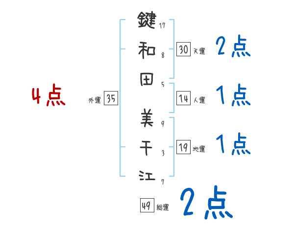 外運![]() | 鍵和田美千江さんの外運は35画の4つ星!温厚な性格で感受性が高い。穏和な性格で人望が厚い。 生活面を象徴する運勢です。外部から受ける影響力を表し、結婚運、家庭運や職場、環境への順応性を表します。 |