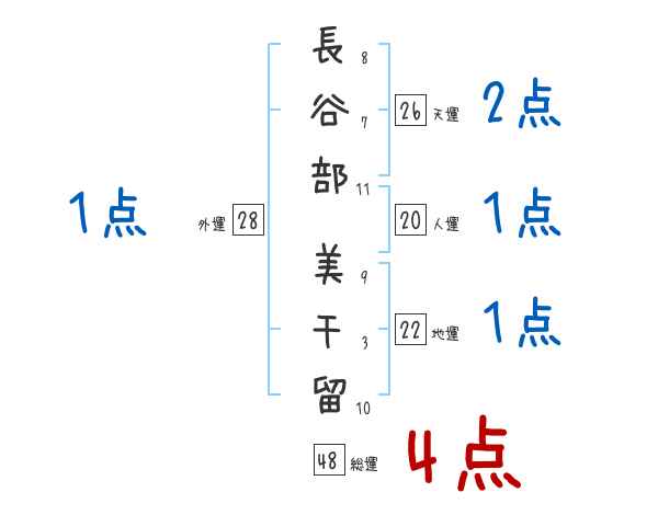 天運![]() | 長谷部美千留さんの天運は26画の2つ星!波瀾万丈かも。信頼できる人を大事にしましょう。 家系が持つ宿命的な運勢を表します。祖先から受け継いだ苗字ですので自分の力が及びません。家柄を象徴します。 |