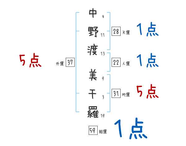 総運![]() | 中野渡美千羅さんの総運は59画の1つ星!意志の弱さであきらめることが多いかも。粘り強さが必要。 あなたの人生を表す1番重要な運勢です。生涯を通じて影響する総合運となり、主に50歳以降の晩年期に影響を及ぼします。 |