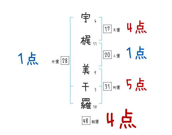 外運![]() | 宇梶美千羅さんの外運は28画の1つ星!家庭環境に注意。スポーツで活躍できる能力があるかも。 生活面を象徴する運勢です。外部から受ける影響力を表し、結婚運、家庭運や職場、環境への順応性を表します。 |
