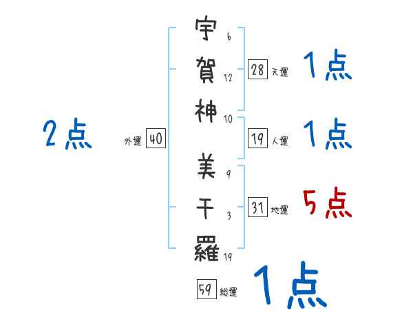 天運![]() | 宇賀神美千羅さんの天運は28画の1つ星!家庭環境に注意。スポーツで活躍できる能力があるかも。 家系が持つ宿命的な運勢を表します。祖先から受け継いだ苗字ですので自分の力が及びません。家柄を象徴します。 |