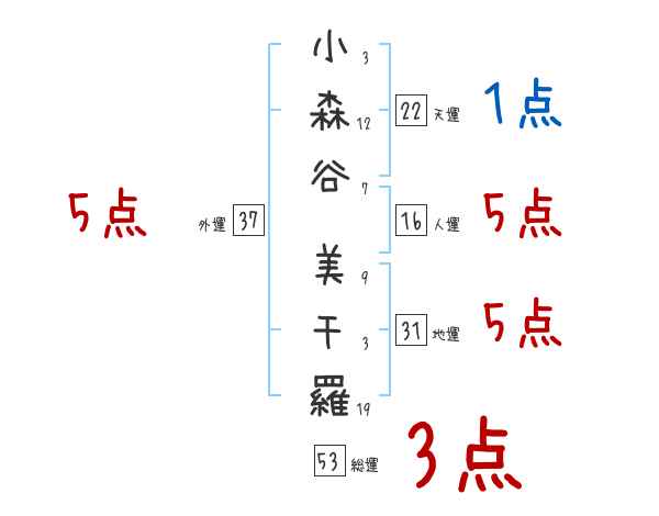 天運![]() | 小森谷美千羅さんの天運は22画の1つ星!努力することが苦手ないっぽう手先が器用。芸術性にも優れる。 家系が持つ宿命的な運勢を表します。祖先から受け継いだ苗字ですので自分の力が及びません。家柄を象徴します。 |