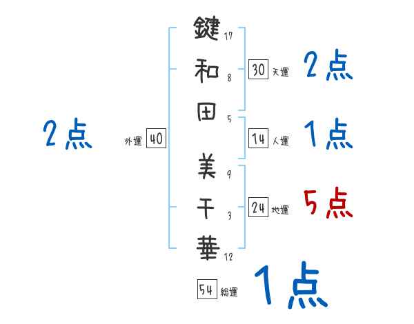 天運![]() | 鍵和田美千華さんの天運は30画の2つ星!浮き沈みの激しさに注意しましょう。 家系が持つ宿命的な運勢を表します。祖先から受け継いだ苗字ですので自分の力が及びません。家柄を象徴します。 |