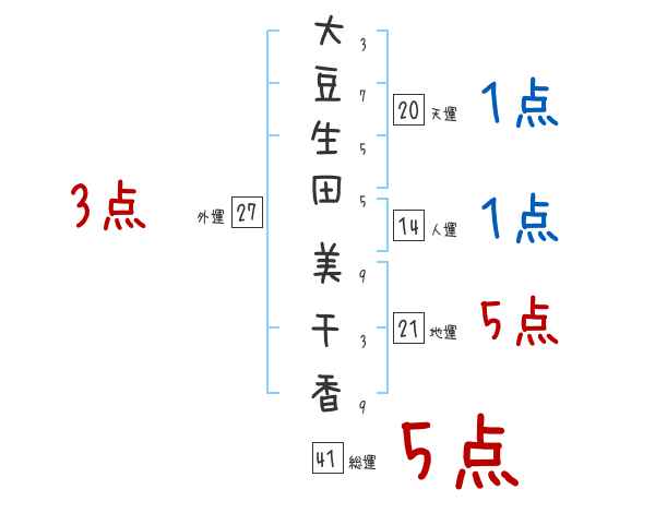 外運![]() | 大豆生田美千香さんの外運は27画の3つ星!頭脳明晰だが強情で摩擦が多い傾向。孤立に注意。 生活面を象徴する運勢です。外部から受ける影響力を表し、結婚運、家庭運や職場、環境への順応性を表します。 |