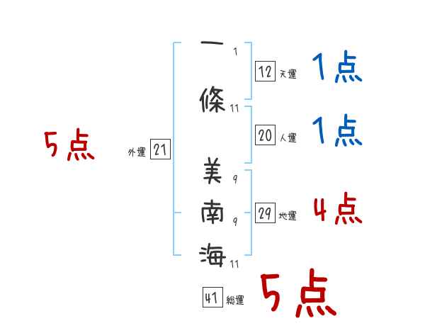 外運![]() | 一條美南海さんの外運は21画の5つ星!統率力がある。独立し成功する。名誉を手に入れる。 生活面を象徴する運勢です。外部から受ける影響力を表し、結婚運、家庭運や職場、環境への順応性を表します。 |