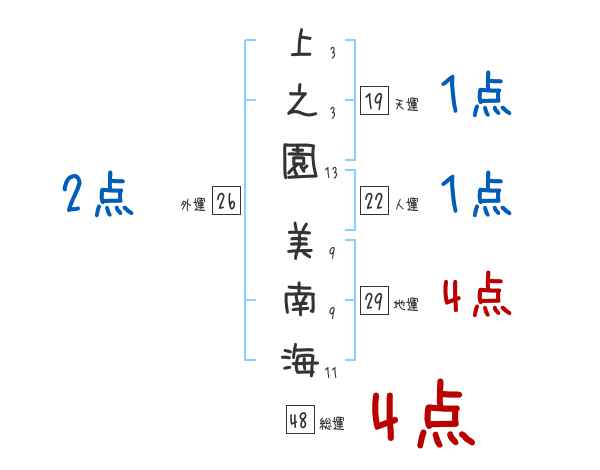 外運![]() | 上之園美南海さんの外運は26画の2つ星!波瀾万丈かも。信頼できる人を大事にしましょう。 生活面を象徴する運勢です。外部から受ける影響力を表し、結婚運、家庭運や職場、環境への順応性を表します。 |