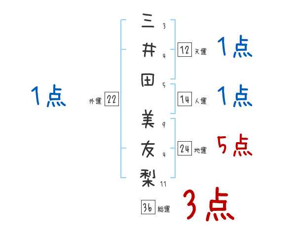 総運![]() | 三井田美友梨さんの総運は36画の3つ星!先見性が豊かです。多少神経質で苦労することも。 あなたの人生を表す1番重要な運勢です。生涯を通じて影響する総合運となり、主に50歳以降の晩年期に影響を及ぼします。 |