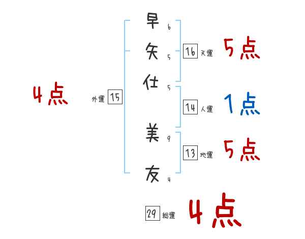 天運![]() | 早矢仕美友さんの天運は16画の5つ星!人望が厚く大きく発展する。逆転成功が見える。 家系が持つ宿命的な運勢を表します。祖先から受け継いだ苗字ですので自分の力が及びません。家柄を象徴します。 |