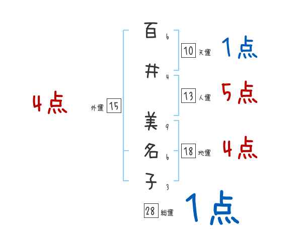 総運![]() | 百井美名子さんの総運は28画の1つ星!家庭環境に注意。スポーツで活躍できる能力があるかも。 あなたの人生を表す1番重要な運勢です。生涯を通じて影響する総合運となり、主に50歳以降の晩年期に影響を及ぼします。 |