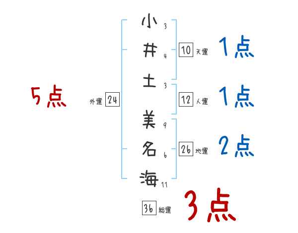 外運![]() | 小井土美名海さんの外運は24画の5つ星!家庭運が良く順調な人生。金運にも恵まれる。 生活面を象徴する運勢です。外部から受ける影響力を表し、結婚運、家庭運や職場、環境への順応性を表します。 |