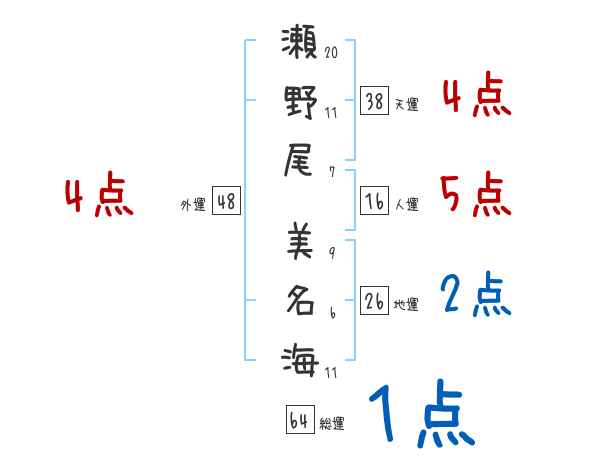 総運![]() | 瀬野尾美名海さんの総運は64画の1つ星!災難が多く精神的なもろさに注意。トラブルに巻き込まれないように気をつけて。 あなたの人生を表す1番重要な運勢です。生涯を通じて影響する総合運となり、主に50歳以降の晩年期に影響を及ぼします。 |