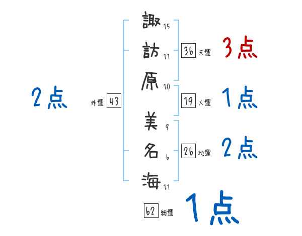 天運![]() | 諏訪原美名海さんの天運は36画の3つ星!先見性が豊かです。多少神経質で苦労することも。 家系が持つ宿命的な運勢を表します。祖先から受け継いだ苗字ですので自分の力が及びません。家柄を象徴します。 |