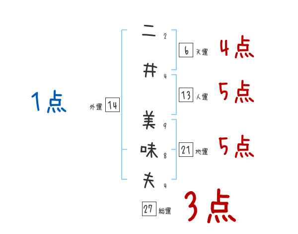 天運![]() | 二井美味夫さんの天運は6画の4つ星!慎重な努力家で信頼を得る。誠実な精神で向上心に優れる。 家系が持つ宿命的な運勢を表します。祖先から受け継いだ苗字ですので自分の力が及びません。家柄を象徴します。 |