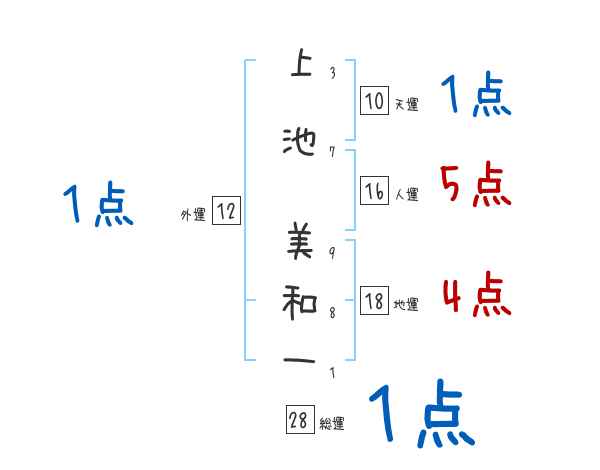 総運![]() | 上池美和一さんの総運は28画の1つ星!家庭環境に注意。スポーツで活躍できる能力があるかも。 あなたの人生を表す1番重要な運勢です。生涯を通じて影響する総合運となり、主に50歳以降の晩年期に影響を及ぼします。 |