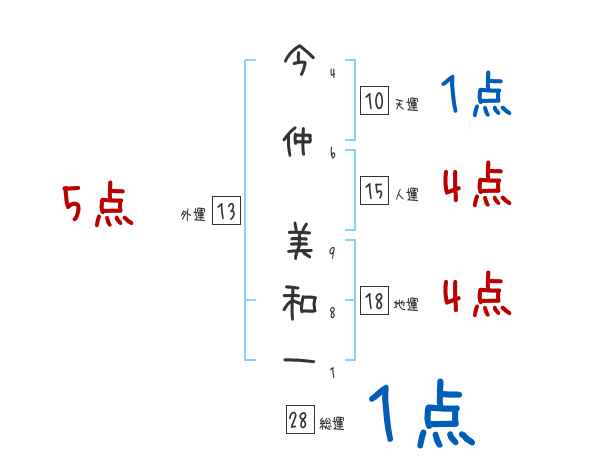 天運![]() | 今仲美和一さんの天運は10画の1つ星!不安を感じやすい傾向。ストレスを抱えないように注意しましょう。 家系が持つ宿命的な運勢を表します。祖先から受け継いだ苗字ですので自分の力が及びません。家柄を象徴します。 |