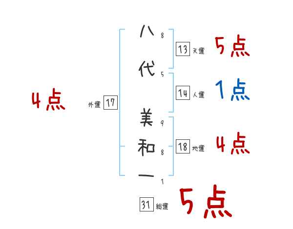 外運![]() | 八代美和一さんの外運は17画の4つ星!積極的な行動力。地位を気づき財産を手に入れる。純粋な心と直感力。 生活面を象徴する運勢です。外部から受ける影響力を表し、結婚運、家庭運や職場、環境への順応性を表します。 |