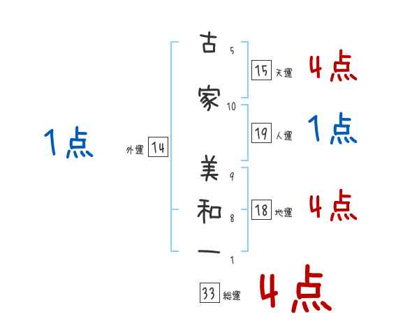 外運![]() | 古家美和一さんの外運は14画の1つ星!人に対して優しいがストレスを溜め込みがち。人間関係のトラブルを避けるよう気をつけましょう。 生活面を象徴する運勢です。外部から受ける影響力を表し、結婚運、家庭運や職場、環境への順応性を表します。 |