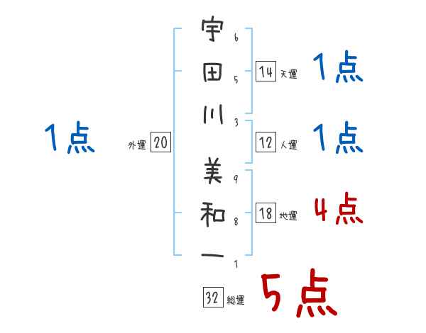 総運![]() | 宇田川美和一さんの総運は32画の5つ星!柔軟性があり成功する。チャンスが多く金運が良い。 あなたの人生を表す1番重要な運勢です。生涯を通じて影響する総合運となり、主に50歳以降の晩年期に影響を及ぼします。 |