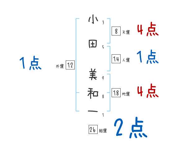 総運![]() | 小田美和一さんの総運は26画の2つ星!波瀾万丈かも。信頼できる人を大事にしましょう。 あなたの人生を表す1番重要な運勢です。生涯を通じて影響する総合運となり、主に50歳以降の晩年期に影響を及ぼします。 |
