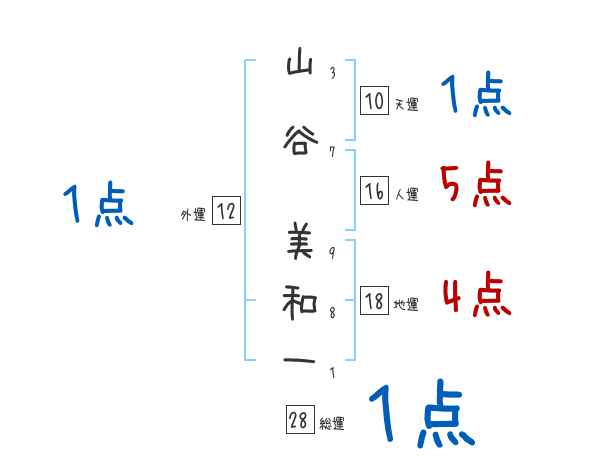 総運![]() | 山谷美和一さんの総運は28画の1つ星!家庭環境に注意。スポーツで活躍できる能力があるかも。 あなたの人生を表す1番重要な運勢です。生涯を通じて影響する総合運となり、主に50歳以降の晩年期に影響を及ぼします。 |
