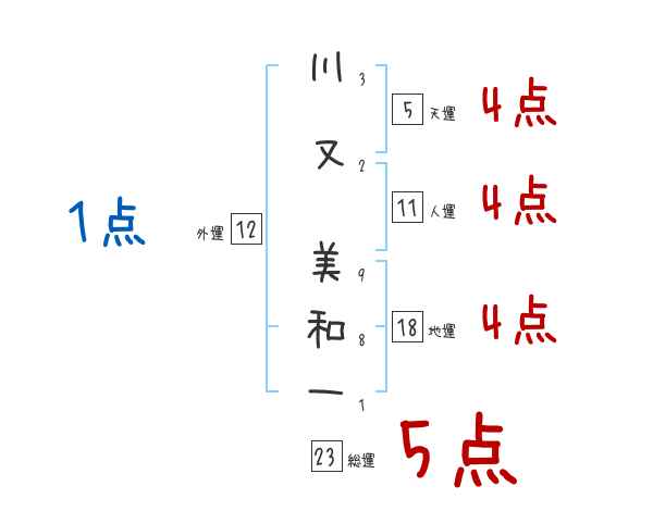 天運![]() | 川又美和一さんの天運は5画の4つ星!健康で安泰。協調性に優れ、財産に恵まれる。 家系が持つ宿命的な運勢を表します。祖先から受け継いだ苗字ですので自分の力が及びません。家柄を象徴します。 |