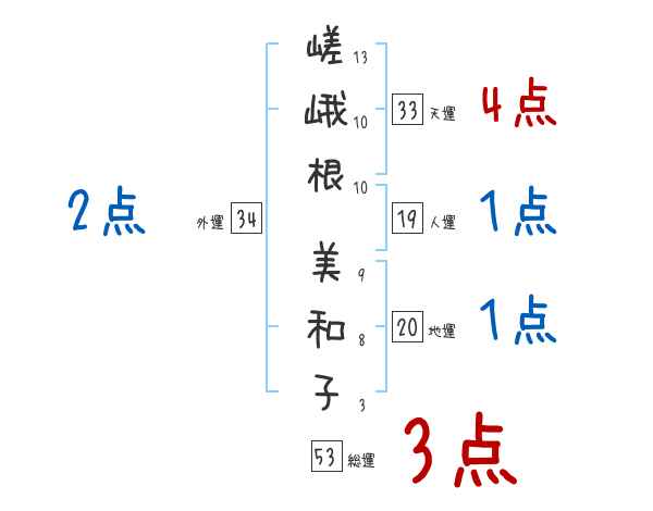 総運![]() | 嵯峨根美和子さんの総運は53画の3つ星!やや見栄っ張りで虚栄心がある。散財に注意。 あなたの人生を表す1番重要な運勢です。生涯を通じて影響する総合運となり、主に50歳以降の晩年期に影響を及ぼします。 |