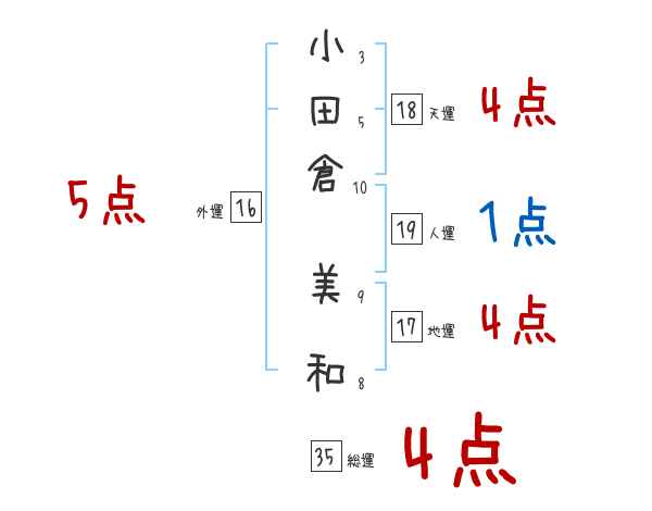 天運![]() | 小田倉美和さんの天運は18画の4つ星!情熱的で剛気。忍耐力があり信頼される。 家系が持つ宿命的な運勢を表します。祖先から受け継いだ苗字ですので自分の力が及びません。家柄を象徴します。 |