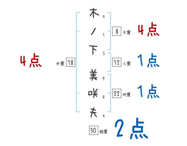 総運![]() | 木ノ下美咲夫さんの総運は30画の2つ星!浮き沈みの激しさに注意しましょう。 あなたの人生を表す1番重要な運勢です。生涯を通じて影響する総合運となり、主に50歳以降の晩年期に影響を及ぼします。 |