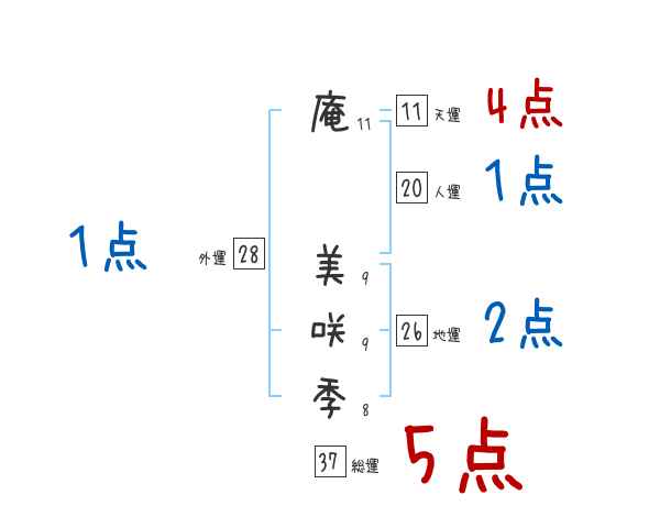 外運![]() | 庵美咲季さんの外運は28画の1つ星!家庭環境に注意。スポーツで活躍できる能力があるかも。 生活面を象徴する運勢です。外部から受ける影響力を表し、結婚運、家庭運や職場、環境への順応性を表します。 |