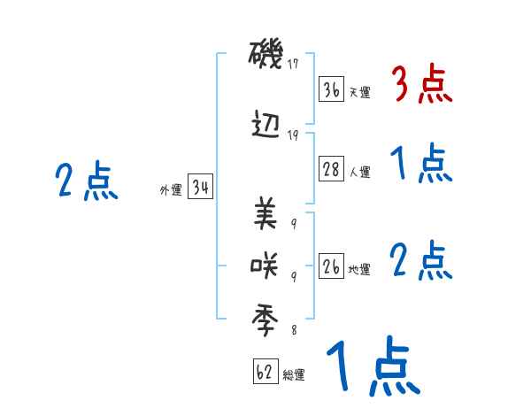 人運![]() | 磯辺美咲季さんの人運は28画の1つ星!家庭環境に注意。スポーツで活躍できる能力があるかも。 性格や才能などを表す2番目に重要な運勢です。人間関係や協調性、社会的な成功に影響します。主に20歳から50歳ぐらいまでの中年期の運勢を表します。 |