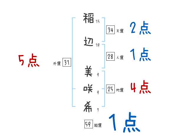 総運![]() | 稲辺美咲希さんの総運は59画の1つ星!意志の弱さであきらめることが多いかも。粘り強さが必要。 あなたの人生を表す1番重要な運勢です。生涯を通じて影響する総合運となり、主に50歳以降の晩年期に影響を及ぼします。 |