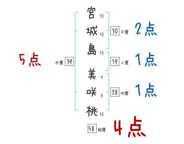 外運![]() | 宮城島美咲桃さんの外運は39画の5つ星!社交性に優れ人望が厚い。人の上に立ち成功する。 生活面を象徴する運勢です。外部から受ける影響力を表し、結婚運、家庭運や職場、環境への順応性を表します。 |
