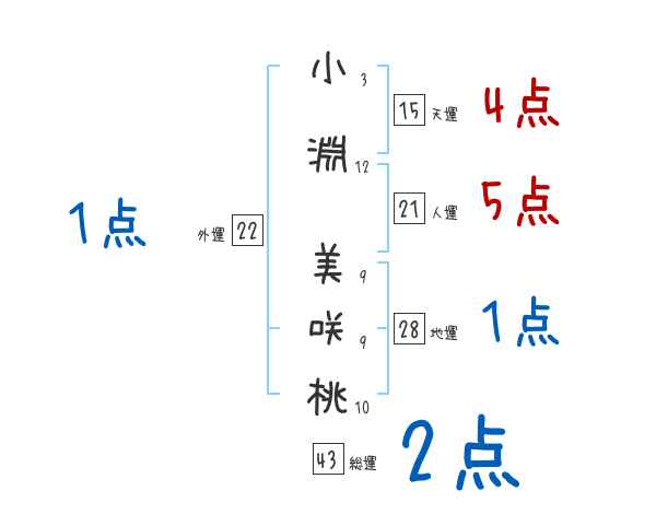 外運![]() | 小淵美咲桃さんの外運は22画の1つ星!努力することが苦手ないっぽう手先が器用。芸術性にも優れる。 生活面を象徴する運勢です。外部から受ける影響力を表し、結婚運、家庭運や職場、環境への順応性を表します。 |