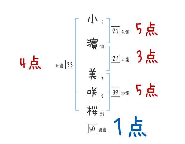 外運![]() | 小濵美咲桜さんの外運は33画の4つ星!権力志向でプライドが高い。勇気があり運を切り開き成功する。 生活面を象徴する運勢です。外部から受ける影響力を表し、結婚運、家庭運や職場、環境への順応性を表します。 |