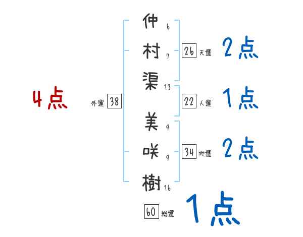 天運![]() | 仲村渠美咲樹さんの天運は26画の2つ星!波瀾万丈かも。信頼できる人を大事にしましょう。 家系が持つ宿命的な運勢を表します。祖先から受け継いだ苗字ですので自分の力が及びません。家柄を象徴します。 |