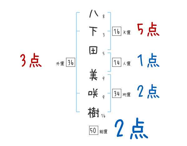 天運![]() | 八下田美咲樹さんの天運は16画の5つ星!人望が厚く大きく発展する。逆転成功が見える。 家系が持つ宿命的な運勢を表します。祖先から受け継いだ苗字ですので自分の力が及びません。家柄を象徴します。 |