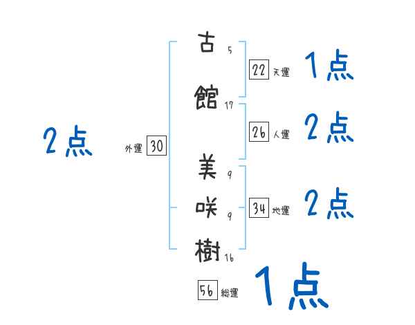 天運![]() | 古館美咲樹さんの天運は22画の1つ星!努力することが苦手ないっぽう手先が器用。芸術性にも優れる。 家系が持つ宿命的な運勢を表します。祖先から受け継いだ苗字ですので自分の力が及びません。家柄を象徴します。 |