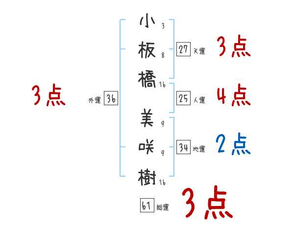 天運![]() | 小板橋美咲樹さんの天運は27画の3つ星!頭脳明晰だが強情で摩擦が多い傾向。孤立に注意。 家系が持つ宿命的な運勢を表します。祖先から受け継いだ苗字ですので自分の力が及びません。家柄を象徴します。 |