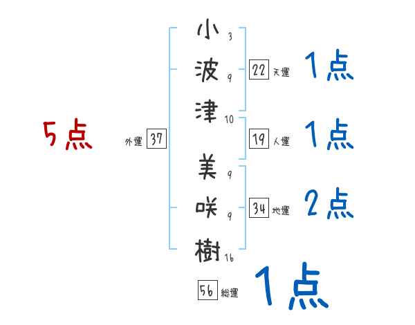 外運![]() | 小波津美咲樹さんの外運は37画の5つ星!努力家で順応性に優れる。現実的な考え方ができ忠実に物事をこなす。 生活面を象徴する運勢です。外部から受ける影響力を表し、結婚運、家庭運や職場、環境への順応性を表します。 |