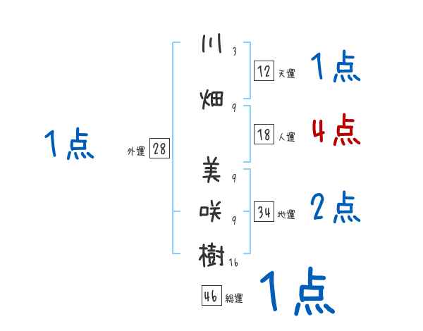 総運![]() | 川畑美咲樹さんの総運は46画の1つ星!迷走することが多く苦労するかも。目先のことにとらわれないように。 あなたの人生を表す1番重要な運勢です。生涯を通じて影響する総合運となり、主に50歳以降の晩年期に影響を及ぼします。 |