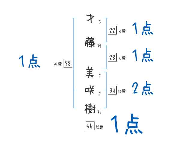 外運![]() | 才藤美咲樹さんの外運は28画の1つ星!家庭環境に注意。スポーツで活躍できる能力があるかも。 生活面を象徴する運勢です。外部から受ける影響力を表し、結婚運、家庭運や職場、環境への順応性を表します。 |
