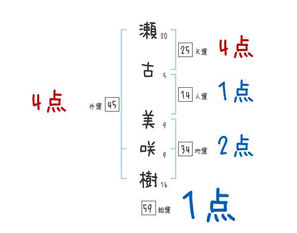 天運![]() | 瀬古美咲樹さんの天運は25画の4つ星!個性があり才能があふれる。強運の持ち主で発展する。 家系が持つ宿命的な運勢を表します。祖先から受け継いだ苗字ですので自分の力が及びません。家柄を象徴します。 |