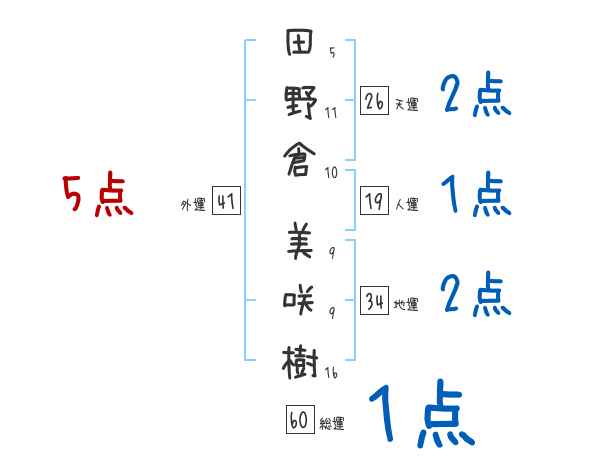 天運![]() | 田野倉美咲樹さんの天運は26画の2つ星!波瀾万丈かも。信頼できる人を大事にしましょう。 家系が持つ宿命的な運勢を表します。祖先から受け継いだ苗字ですので自分の力が及びません。家柄を象徴します。 |