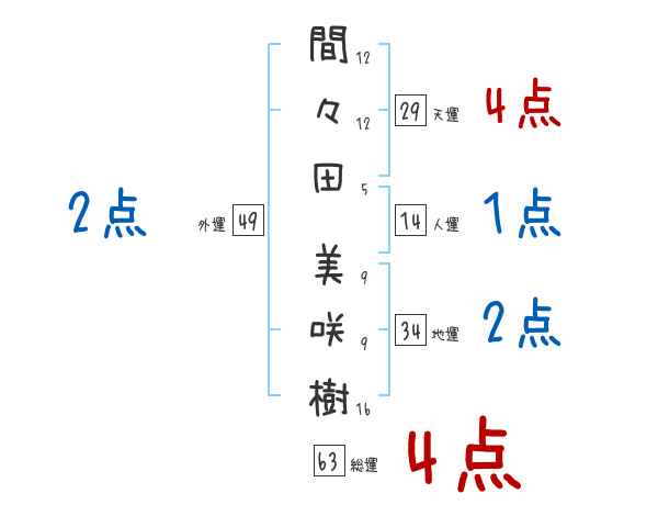 天運![]() | 間々田美咲樹さんの天運は29画の4つ星!完全主義で才能がある。厳格な心の持ち主。 家系が持つ宿命的な運勢を表します。祖先から受け継いだ苗字ですので自分の力が及びません。家柄を象徴します。 |